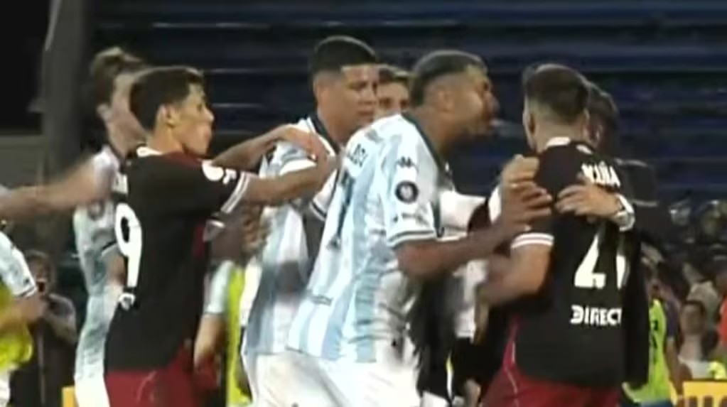 Inmediatamente después de que el árbitro Mastrángelo marcó el final del partido, ambos futbolista volvieron a buscarse y comenzaron los forcejeos. En medio de esta escena, “Rocky” tuvo una acción desagradable, a centímetros de la cara del campeón del mundo, que enloqueció.