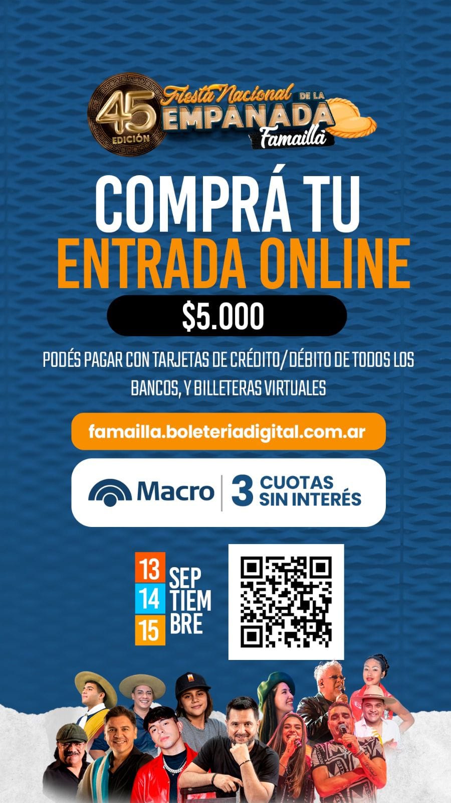 Ventas de entradas en el predio a partir de 18 hs.También podes comprar tus entradas on lineVisita nuestro portal de ventas https://famailla.boleteriadigital.com.ar/.Entrada general $5000.