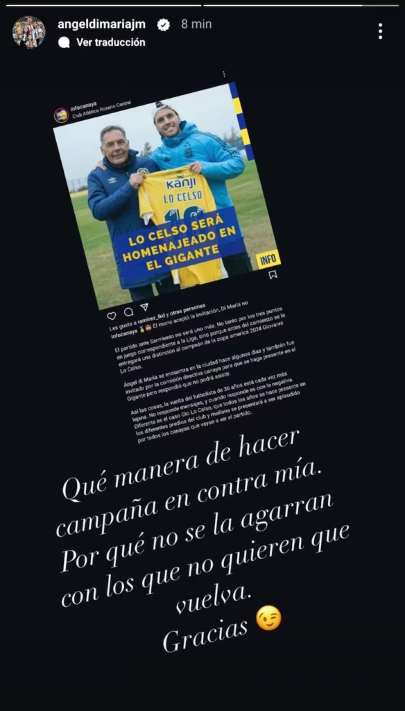 En este posteo de Instagram de Infocanaya se arremetió contra el futbolista rosarino de manera indirecta: destacaron el homenaje que recibirá en el Gigante de Arroyito Giovani Lo Celso, pero señalaron que Ángel Di María habría rechazado la invitación por seguridad