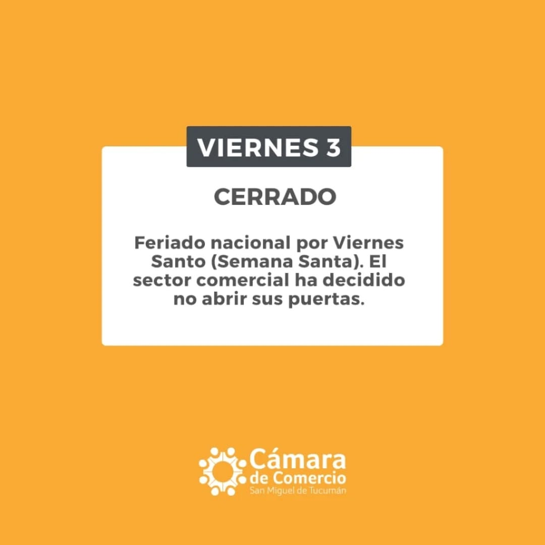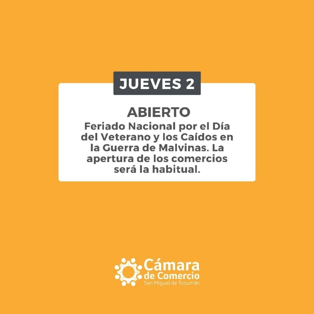 La Cámara de Comercio de San Miguel de Tucumán ha comunicado oficialmente la modalidad de trabajo para los próximos días festivos de abril. Según el cronograma difundido, el jueves 2 de abril, fecha en que coinciden el feriado nacional inamovible por el Día del Veterano y de los Caídos en la Guerra de Malvinas con el Jueves Santo (día no laborable), la apertura de los comercios será la habitual.