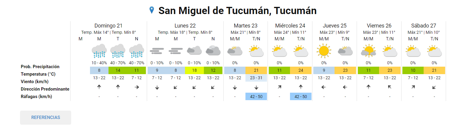 Luego de una extensa jornada por el Día del Amigo, los tucumanos y tucumanas tendrán un domingo ideal para descansar en sus hogares, tomando mates y consumiendo harinas varias. Así el Servicio Meteorológico Nacional pronosticó 8 grados con probabilidades de lluvia de 10 y 40 por ciento, y los vientos del sur correrán a una velocidad de entre 13 y 22 kilómetros por hora. La humedad sería del 97 por ciento, y la visibilidad sería regular.Después del mediodía el cielo estará con lloviznas y los vientos del sector este tendrán velocidades estimadas entre 13 y 22 km/h. La temperatura pronosticada sería de 14 grados.A la noche, el clima rondará los 12 grados, mientras que los vientos serán del este a una velocidad de 13 y 22 kilómetros por hora, mientras que la probabilidad de lluvia estaría en el orden del 10 y 40 por ciento.