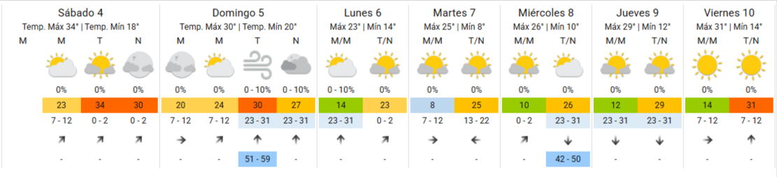 En cuanto al domingo, el SMN anticipa que el termómetro caerá con respecto a hoy, ya que la máxima será de 30ºC, con una tarde mucho viento. El lunes, la máxima seguirá en descenso y solo alcanzará los 23°C.