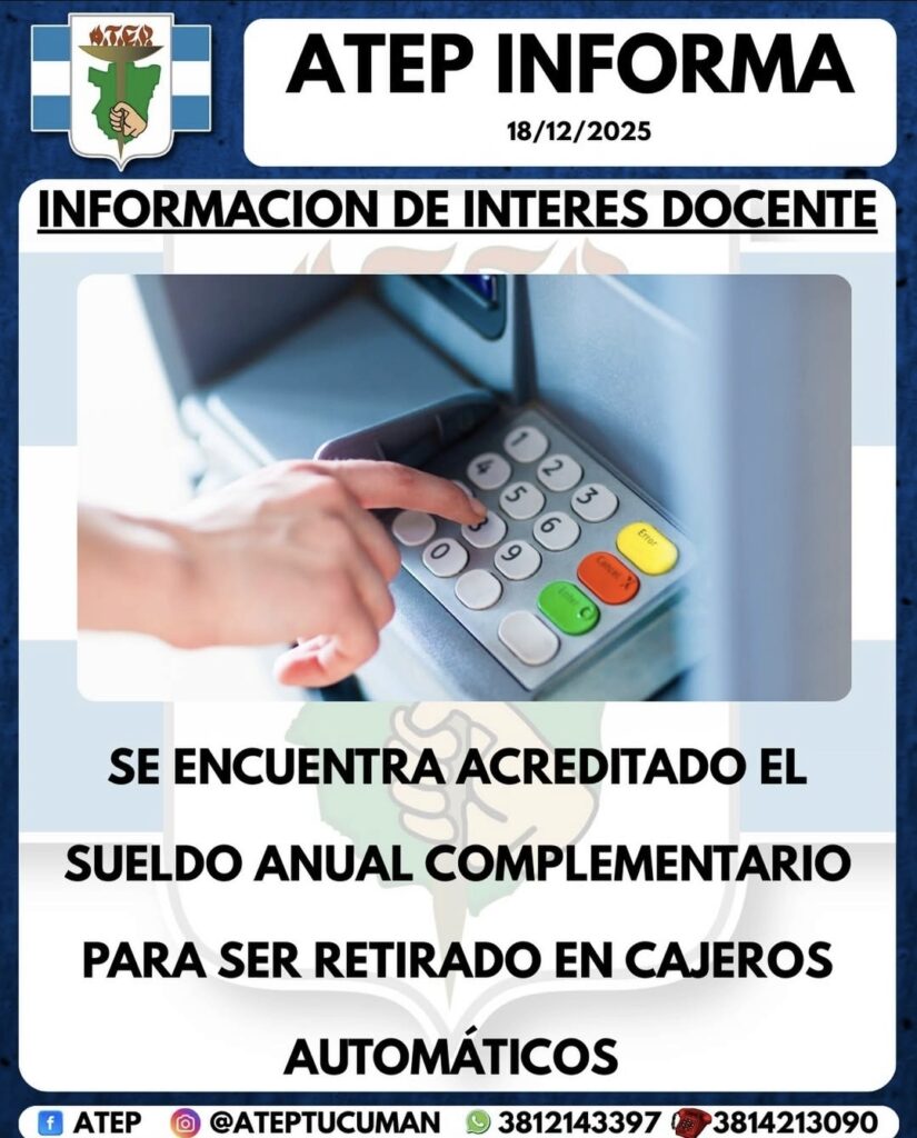 Desde ATEP se informa a toda la docencia que ya se encuentra acreditado el Sueldo Anual Complementario (SAC), el cual puede ser retirado a través de los cajeros automáticos correspondientes.