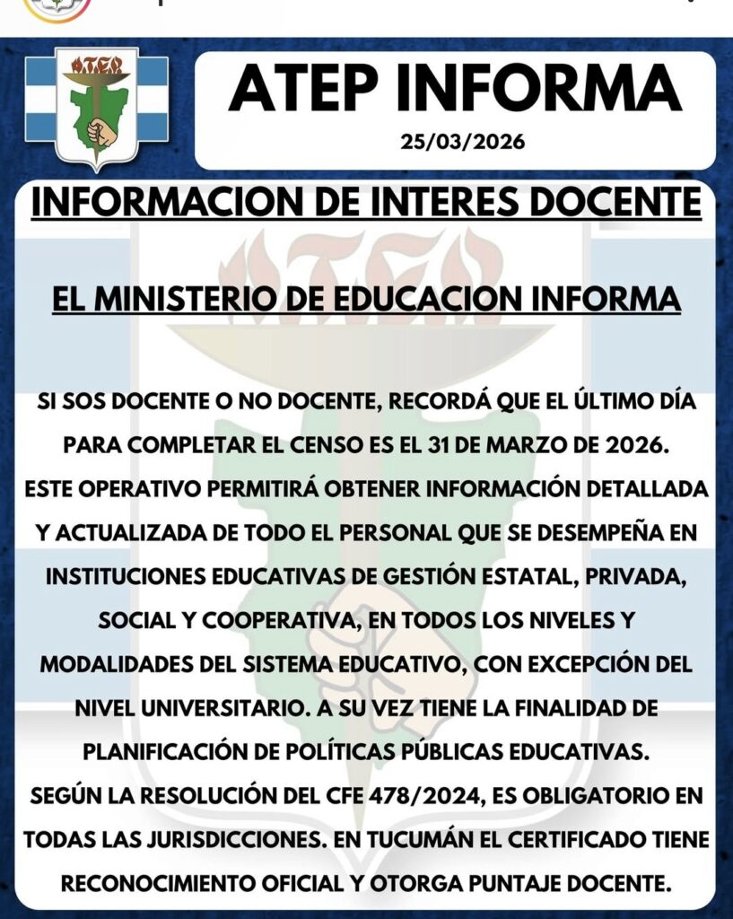 La Asociación de Trabajadores de la Educación de Tucumán (ATEP) emitió un comunicado importante en el que recuerda a docentes y no docentes la obligatoriedad de completar el Relevamiento Anual del Personal Educativo (ReNPE 2025).