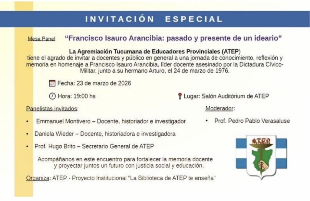 La Agremiación Tucumana de Educadores Provinciales (ATEP) anunció la realización de una mesa panel titulada “Francisco Isaura Arancibia: pasado y presente de un ideario”, destinada a docentes y al público en general.