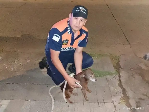 La dueña del can llamó a los efectivos de la Comisaría Séptima para pedir ayuda y rápidamente se comunicaron con los bomberos quienes llegaron a la vivienda y mediante una cuerda pudieron extraer a la mascota desde la profundidad del pozo.