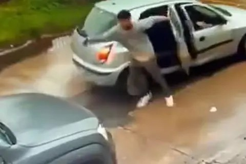 La víctima no se rinde, vuelve sobre los delincuentes e intenta recuperar su mochila. Por otra parte, el auto en el que se movilizaban regresa, marcha atrás y se queda justo al lado de donde los dos ladrones comienzan a atacar al hombre cuando cae al piso.