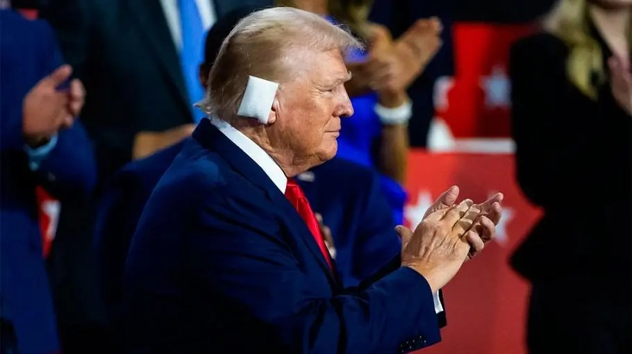 El candidato republicano Donald Trump llegó de sorpresa este lunes a la convención republicana en Milwaukee con la oreja derecha vendada ante una multitud que le aclamaba.