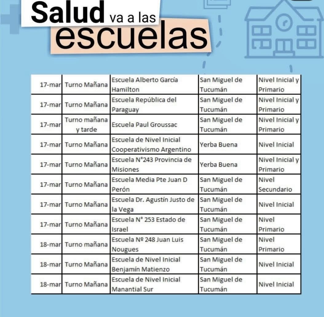 ATEP, Agremiacion Tucumana de Educadores Provinciales informa el cronograma de los operativos móviles que el Ministerio de Salud llevará a escuelas para acercar servicios a la comunidad educativa.