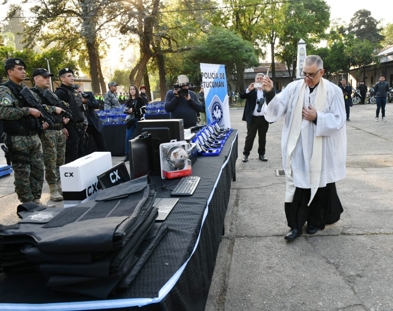 Tras el acto, el Gobernador destacó: «Hemos venido a traer aproximadamente más de 700 pistolas, 150 escopetas, más chalecos antibala para el Servicio Penitenciario, lo que tiene que ver con mejorar la informática, la tecnología para la inteligencia criminal de la Policía de Tucumán, como son computadoras, escáneres y otros elementos para poner a disposición tanto del Servicio Penitenciario como de la Policía de Tucumán. Ustedes no se olviden que ya estamos empezando a equipar tecnológicamente lo que es la cárcel de Benjamín Paz como así también Delfín Gallo, porque hasta fin de año como nos habíamos comprometido vamos a empezar a descomprimir las comisarías».