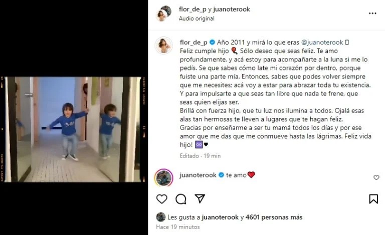 Este jueves, con motivo de su cumpleaños número 16, su mamá le dedicó un sentido mensaje en sus redes sociales. “¡Feliz cumple, hijo! Solo deseo que seas feliz. Te amo profundamente y aquí estoy para acompañarte hasta la luna si me lo pedís”, escribió la actriz junto a un video de Juan de pequeño bailando el clásico “Tuta Tuta” de Los Auténticos Decadentes.