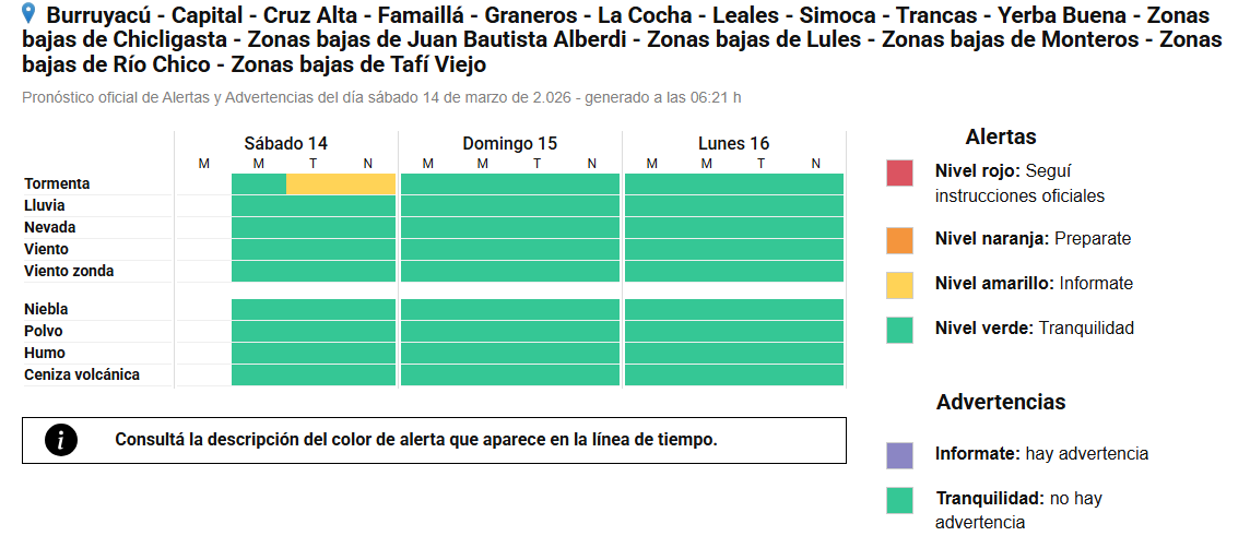 Tras un viernes inestable y con leves precipitaciones, el Servicio Meteorológico Nacional (SMN) adelantó para este sábado 14 de marzo que Tucumán tendrá una nueva jornada bajo alerta amarilla por tormentas.