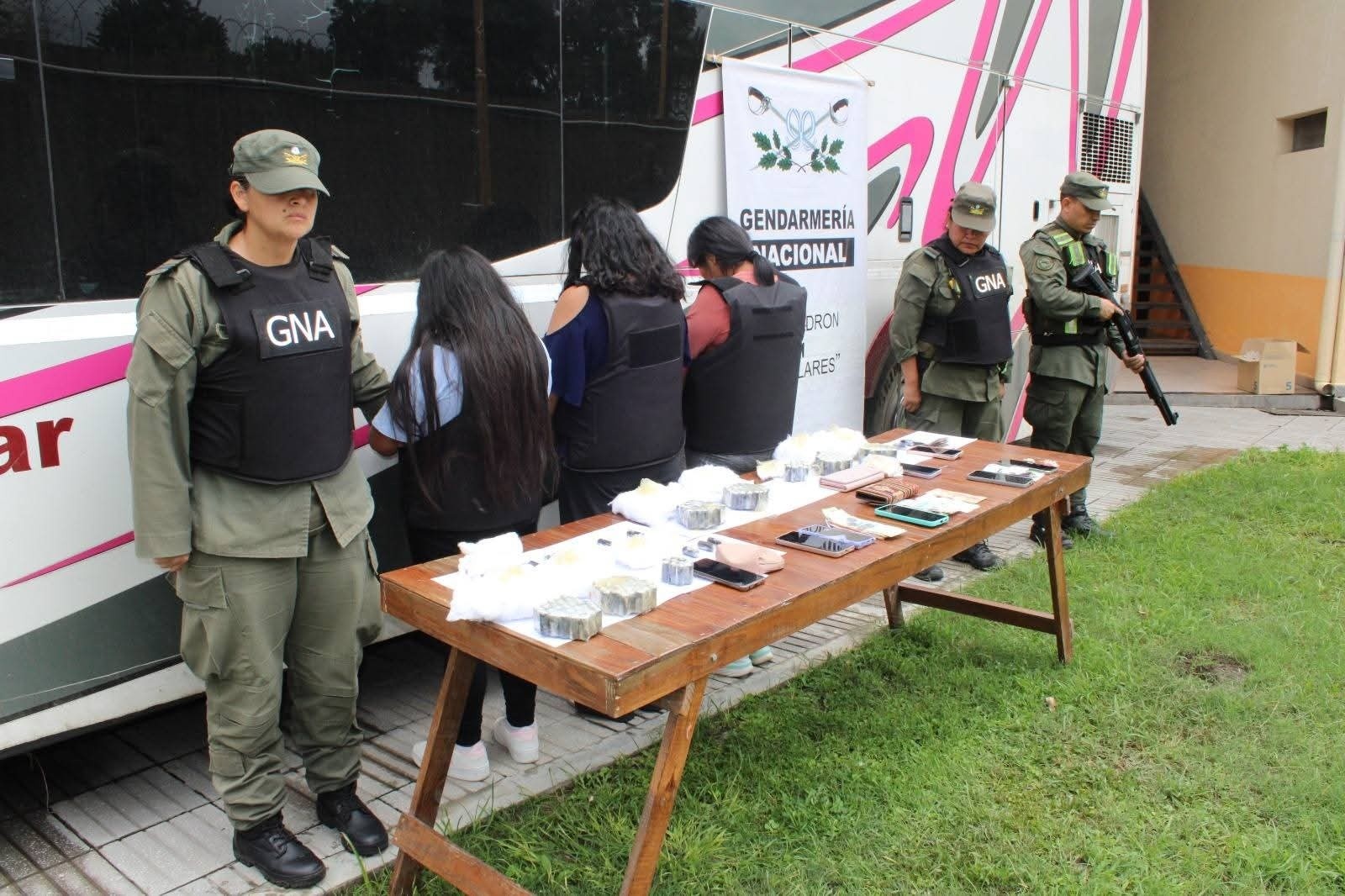 Gendarmería y el micro con parte de las carga y algunas de las personas detenidas durante el proceso, que descubrió el uso de más de 700 cápsulas ingeridas por un total de 9 mulas narco disimuladas entre el pasaje.