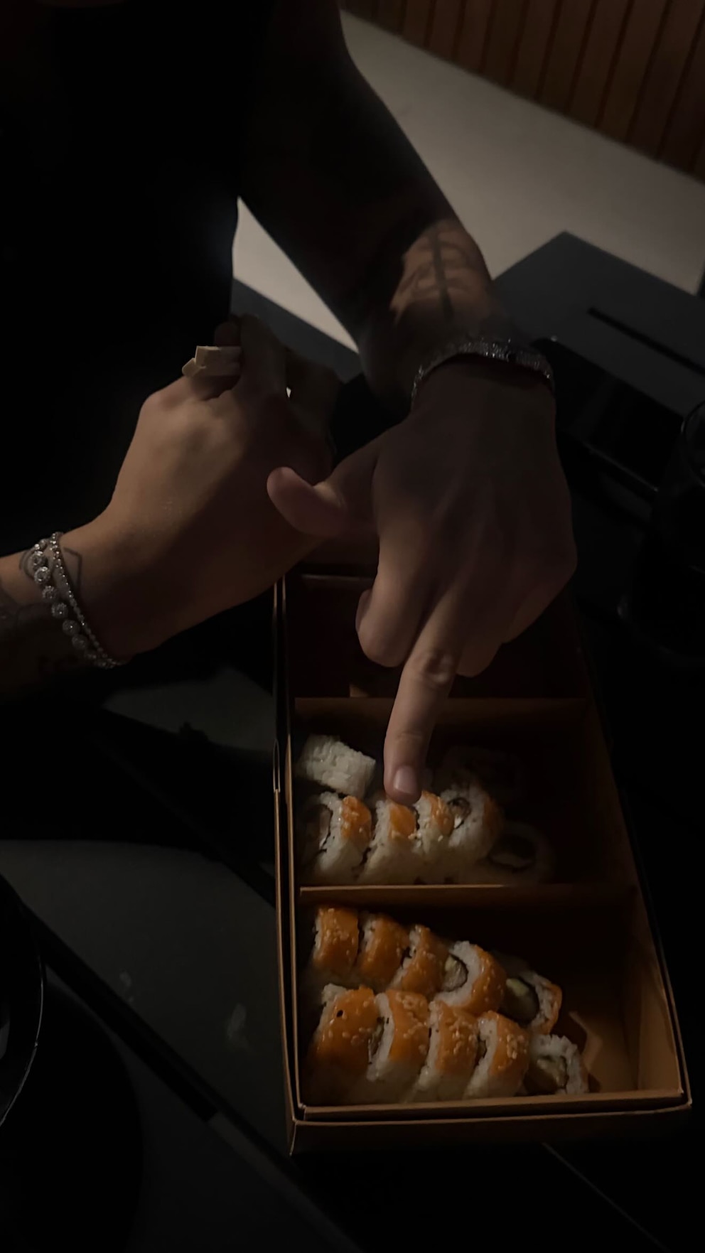 En las últimas horas, la dupla compartió en sus historias el registro de una cena íntima. En la primera imagen se ven sus manos entrelazadas y señalando juntos una bandeja de sushi, en un clima de confianza y conexión. La luz baja, el encuadre cerrado y la composición de la fotografía refuerzan la intimidad de ese momento compartido.