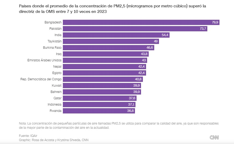 Según la OMS, es responsable de unos siete millones de muertes prematuras al año en todo el mundo.Según precisaron especialistas de la OMS, “la exposición a la contaminación atmosférica por PM2,5 provoca y agrava numerosos problemas de salud, como el asma, el cáncer, los accidentes cerebrovasculares y las enfermedades pulmonares. Además, la exposición a niveles elevados de partículas finas puede perjudicar el desarrollo cognitivo de los niños, provocar problemas de salud mental y complicar enfermedades ya existentes, como la diabetes”.
