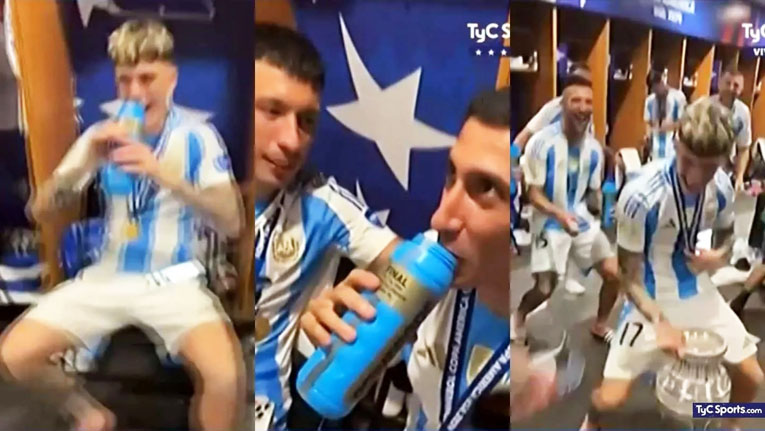 Leandro Paredes fue el encargado de armar el ’viajero’ que iba pasado de mano en mano entre los jugadores, que por momentos se sentaban y en otros se levantan para saltar y cantar ante la arenga de alguno de ellos. Ahí se pudo ver un particular baile de Garnacho, meneando sobre el trofeo de la Copa América, que posaba en el centro de la escena. También Otamendi lo hizo tomar fernet al juvenil de 20 años, que logró su primer título desde que decidió ser argentino.