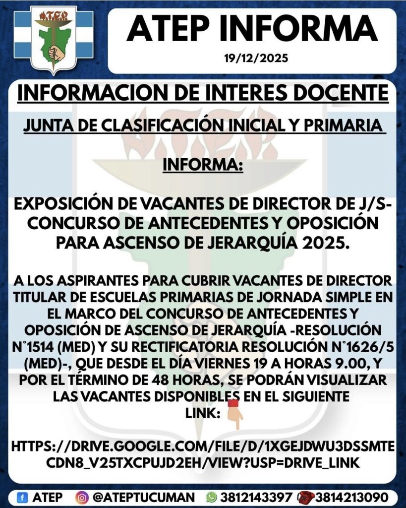 La Junta de Clasificación Inicial y Primaria comunica la exposición de vacantes de Director de Jornada Simple, en el marco del Concurso de Antecedentes y Oposición para Ascenso de Jerarquía 2025.