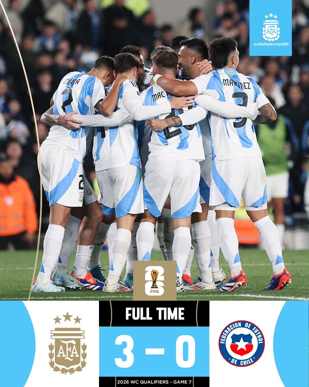 La selección argentina se impuso 3-0 a Chile en el Estadio Monumental por la séptima fecha de las Eliminatorias Sudamericanas rumbo al Mundial 2026. Luego de cerrar el primer tiempo sin goles, los dirigidos por Lionel Scaloni abrieron la cuenta a través de Alexis Mac Allister en el inicio del complemento. Julián Álvarez y Paulo Dybala marcaron en el último cuarto de hora para lograr el sexto triunfo de la Albiceleste sobre siete presentaciones.