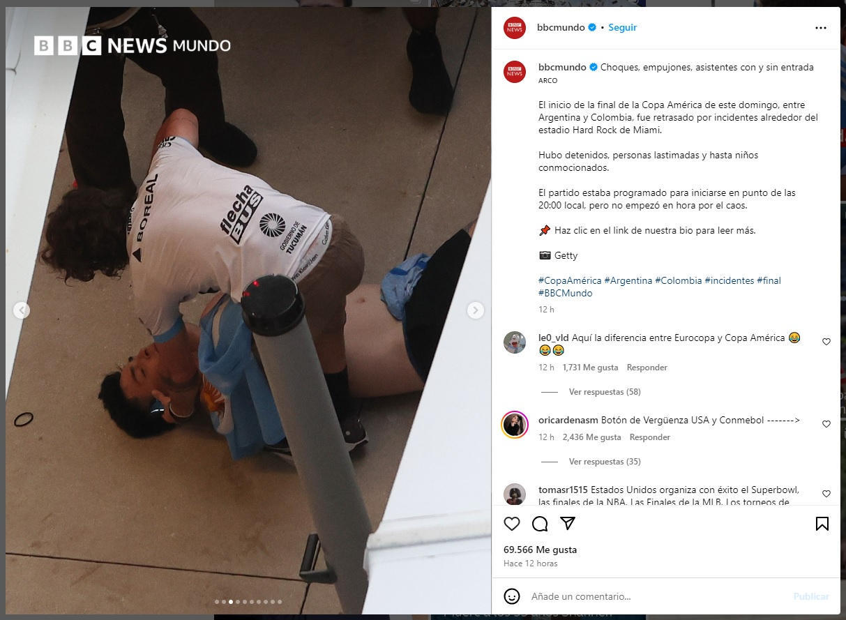 La última imagen fue una de las más tristes de la noche, cuando un joven con la camiseta de Atlético apareció en la transmisión televisiva tratando de asistir a un hincha desmayado durante los incidentes a la hora del ingreso. Fue tal la magnitud del desastre, que este decano aparición en las redes sociales de la BBC, que hizo una galería de fotos en Instagram para mostrar mundialmente la magnitud de lo que fue la previa del partido. /eltucumano