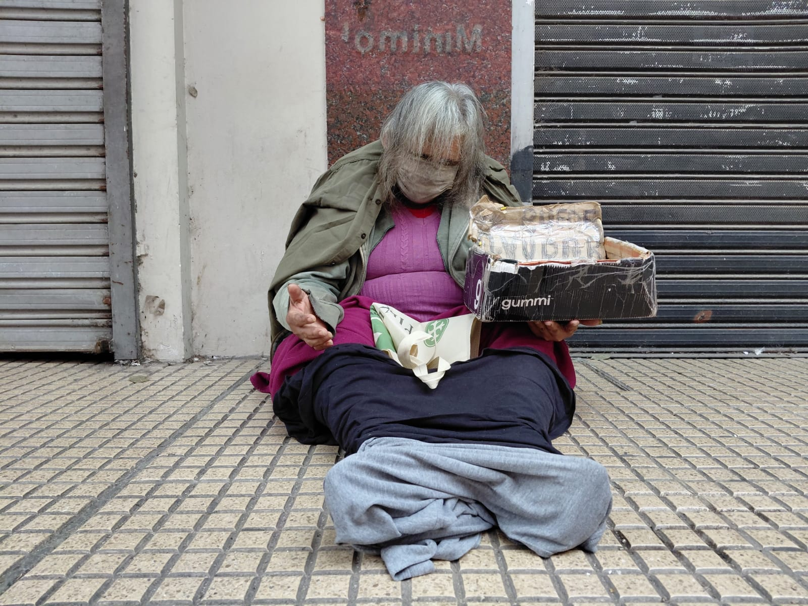 Sentada sobre el cemento frío, con los pies descalzos y una gasa cubriendo su empeine izquierdo, sostiene una caja vacía de zapatos con un cartel escrito a mano: “¿Me puede ayudar?”. Dentro, tres estampitas —San Cayetano, el Sagrado Corazón de Jesús y la Virgen del Valle— acompañan su pedido silencioso.