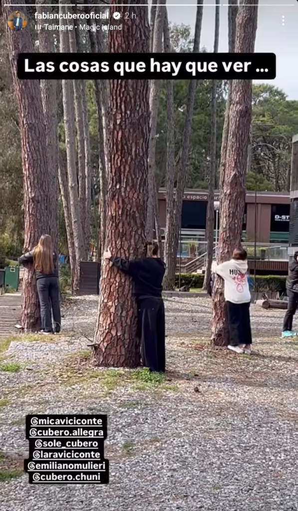 Por eso, en las últimas horas, Fabián compartió un video en Instagram de la peculiar terapia que hicieron sus hijas con Mica. En la grabación mostró que Sienna y Allegra abrazaron los troncos de los árboles que estaban en el lugar.
