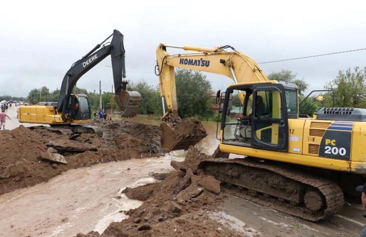 Por decisión de personal técnico especializado se decidió que dos máquinas retroexcavadoras rompieran la ruta en la zona norte y el agua fue guiada para que escurra.