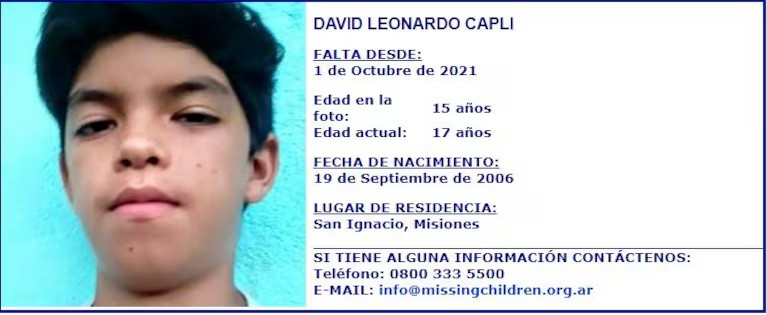 Leonardo David Capli vivía en la localidad de San Ignacio, Misiones. (Foto: captura Missing Children)