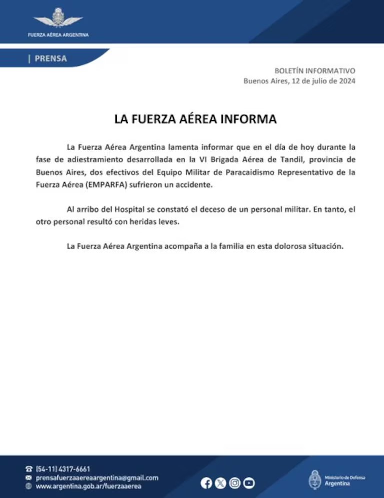 “La Fuerza Aérea Argentina lamenta informar que hoy durante la fase de adiestramiento desarrollado en la VI Brigada Aérea de Tandil, provincia de Buenos Aires, dos efectivos del Equipo Militar de Paracaidismo Representativo de la Fuerza Aérea sufrieron accidente”, indicaron fuentes oficiales en un comunicado.