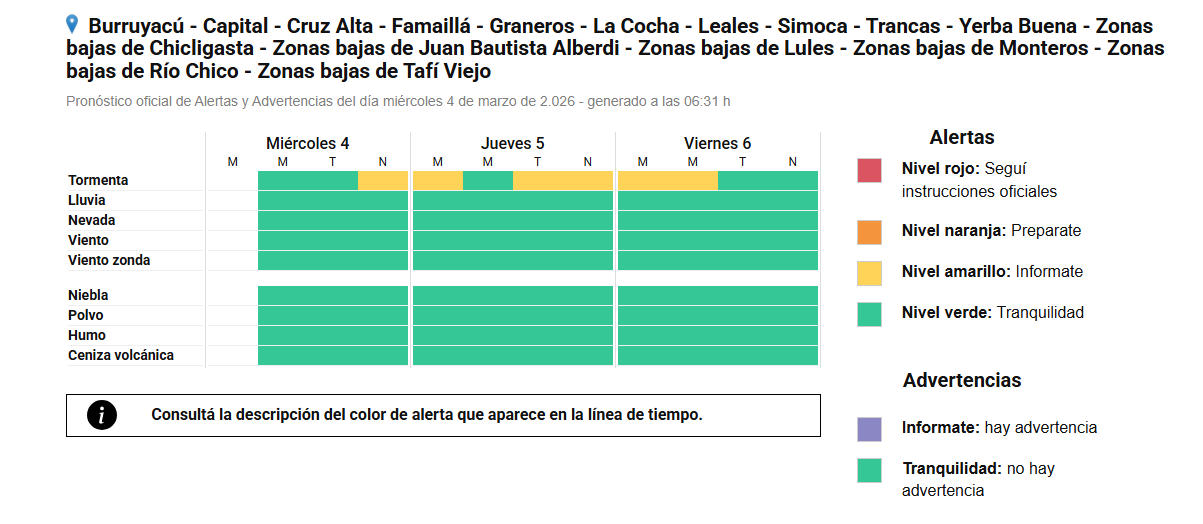 Tras un martes inestable y con tormentas, el Servicio Meteorológico Nacional (SMN) adelantó para este miércoles 4 de marzo que Tucumán tendrá una nueva jornada bajo advertencia amarilla por tormentas, que se extendería hasta el viernes por la mañana.