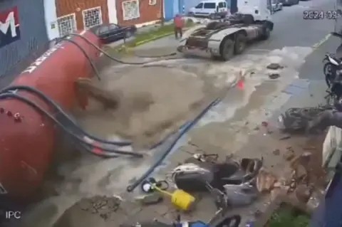 Una cámara de seguridad reflejó el momento cuando el vehículo descendió de una loma y aplastó unas motos que se encontraban estacionadas en el lugar, al tiempo que el contenido inundó lacalle.