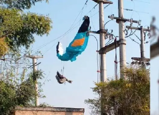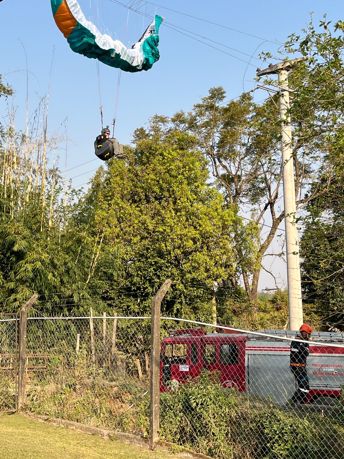 Mientras uno de los residentes se disponía a ingresar al barrio, divisó a un hombre colgando en su parapente y atascado entre los cables de alta tensión dispuestos a lo largo de todo el camino.