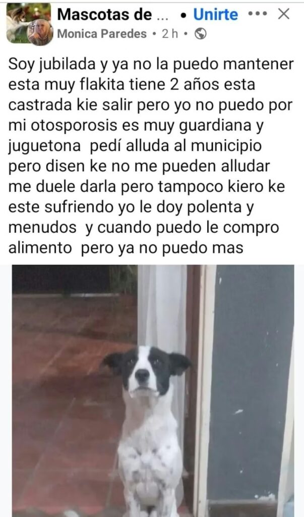En medio de esa situación desesperante, decidió publicar un posteo en un grupo de vecinos de Facebook para ponerla en adopción, atravesada por el dolor de tener que despedirse de su mejor amiga. En diálogo con TN, Mónica expresó lo duro que fue enfrentarse a esa opción: “Anoche veía que está muy flaca, que la tengo que vacunar. Yo sé que es caro y con mi jubilación mínima no puedo, pero tampoco puedo verla así”.